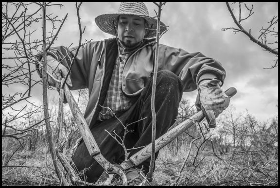 Ramon Torres, President of Familias Unidas por la Justicia, prunes blueberry bushes on the land of the union's new cooperative, Tierra y Libertad.