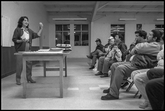 DELANO, CA - 1995 - Dolores Huerta, vice-president and one of the founders of the United Farm Workers, talks with group of workers from one of the world's largest rose growers. The workers had voted for the union, and Huerta, who was negotiating the first labor contract, was reporting to the workers about the bargaining.