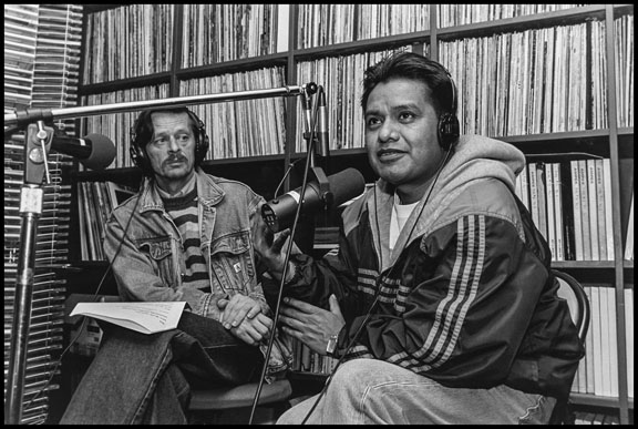 Rufino and journalist Eduardo Stanley on their bilingual program for farm workers on KFCF radio. Photo copyright (c) 2019 by David Bacon.