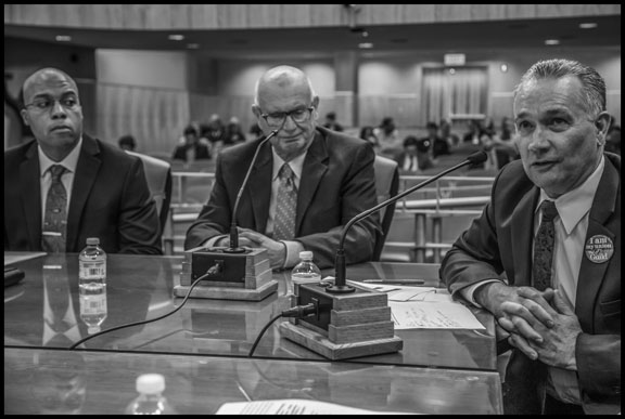 CFT Community College Council President Jim Mahler, right, testifies in opposition to Calbright, the new fully-online community college.