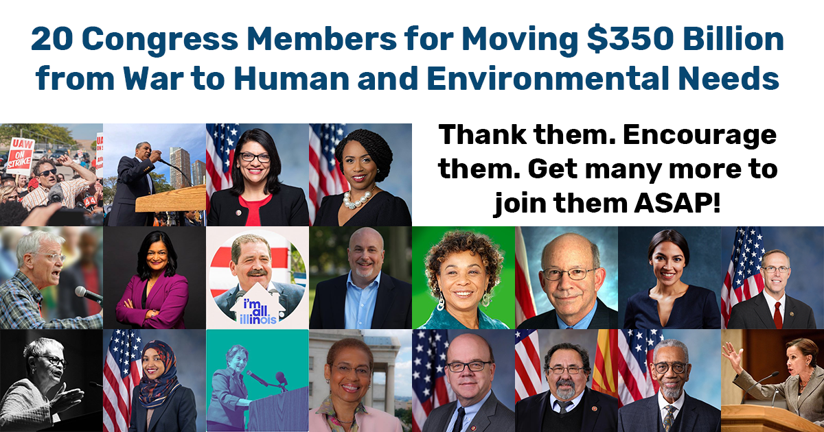 The U.S. Congress has 100 Senators and 435 House Members. Out of the full 535, there are 20 thus far who have made themselves sponsor or cosponsor of a resolution to do what is most badly needed, move major amounts of money out of wars and war preparations and into human and environmental needs.
