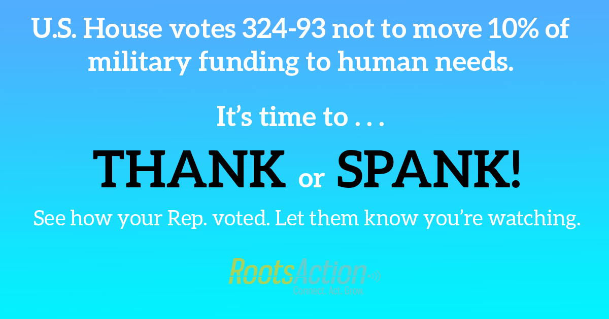 The U.S. House of Misrepresentatives on Tuesday voted 324 to 93 (with 13 not voting) to defeat a proposal to move a mere 10% of military spending to human, environmental, and health needs. The 324 people who voted the wrong way on this really should never show their faces in public again. Our society ought to shame them so deeply that they pick up and move to a country with healthcare and retirement and clean energy and a decent education system where they can discover what they’ve been depriving the United States of, as well as discover what they’ve been inflicting on the world. Certainly, nobody should ever vote to elect any of them again.