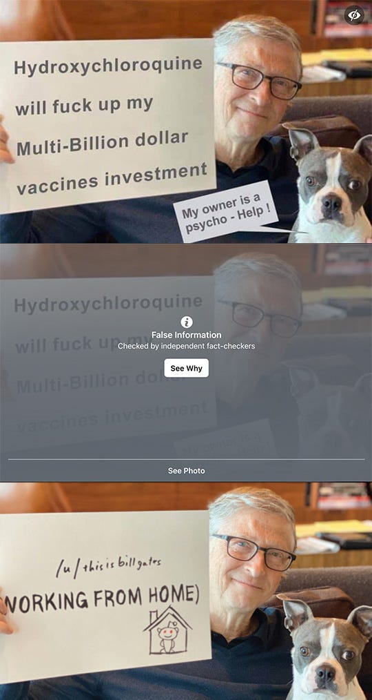 Over one of the obviously fake & comedic memes, there was a “false information” alert with a link going to the original corrected & factually accurate image.