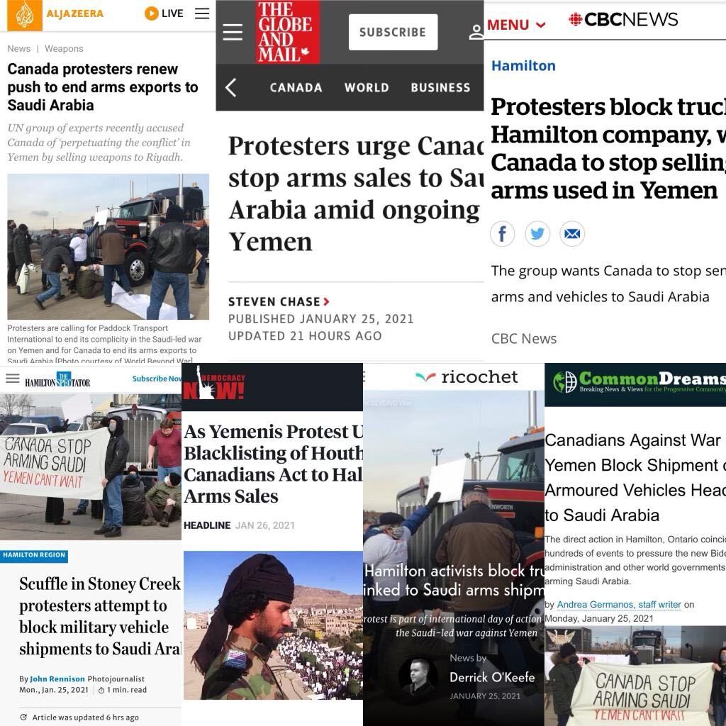 Media coverage has included: Democracy Now!, CBC, Al Jazeera, Globe and Mail, Ricochet, Common Dreams, Hamilton Spectator, Yemeni State television, and Middle East Monitor. Here’s a collage: