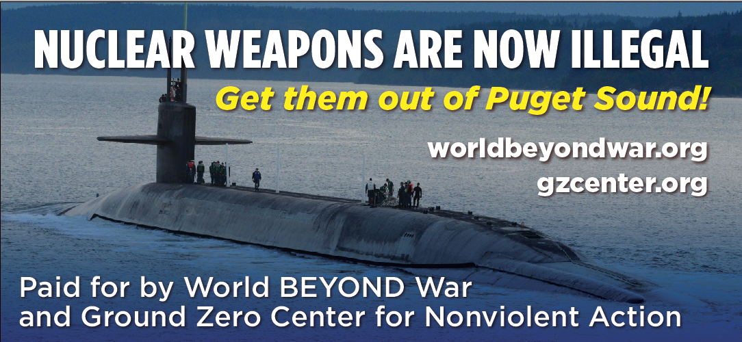 From January 18 to February 14, four large billboards are going up around Seattle that proclaim “Nuclear Weapons Are Now Illegal. Get them out of Puget Sound!”