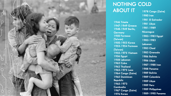 The second most important fact about the Cold War is that it wasn’t cold. While wealthy nations have not fought each other, the proxy wars and wars on poor nations and coups have killed millions and have never let up. The U.S., in 2021, arms, trains, and/or funds the militaries of 48 of the 50 most oppressive governments on earth, with no need of a “communist threat” to justify it. It’s normal now.