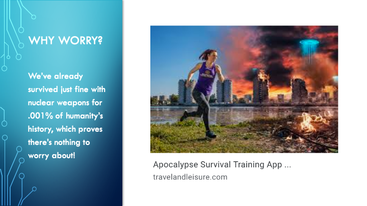 The Cold War created the habit of living with the risk of apocalypse, and conditioned people (through their survival over what they imagine to be a long period of time) to think the threat was overblown — many of them assume the climate threat is overblown too.