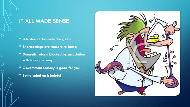 There were serious scholars who believed that when the USSR ended, so would U.S. militarism. Earlier, others had believed the same about the end of the wars on the Native Americans. But the mad drive to dominate everyone, and the corruption of the weapons business, will not end because a particular sales pitch ends. New spins will be found, and old standbys revived, until benevolent imperialism is simply normal: