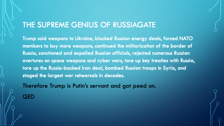 Russiagate depicted a U.S. president engaged in numerous acts of hostility toward Russia as secretly a servant of the Russian president. In many countries a major effort would have been needed to get people to believe such a thing. Not in the post-Cold War U.S.