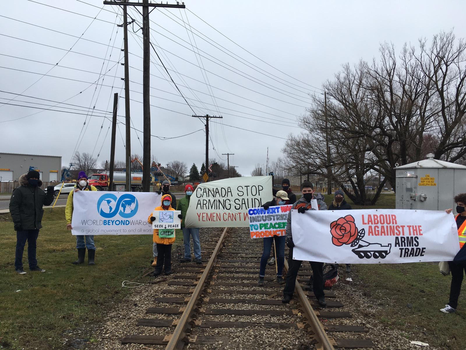 London, Ontario – Members of anti-war organizations World BEYOND War, Labour Against the Arms Trade, and People for Peace London are blocking railway tracks near General Dynamics Land Systems-Canada, a London-area company manufacturing light armoured vehicles (LAVs) for the Kingdom of Saudi Arabia.