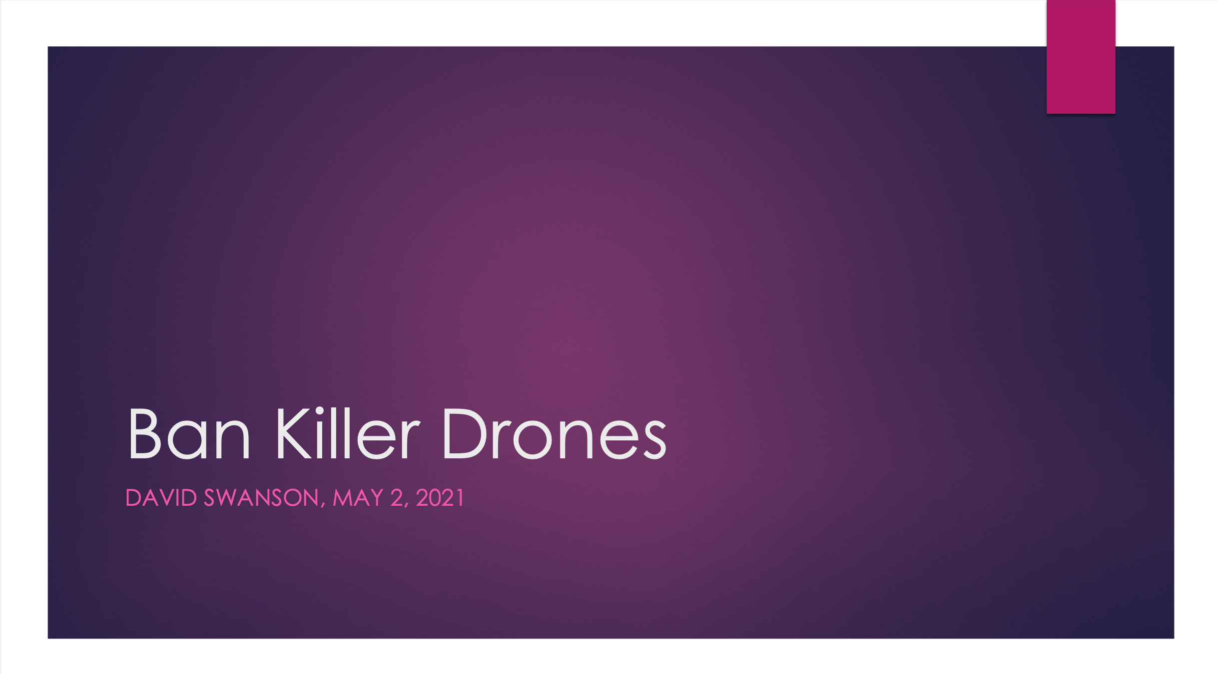 An additional hurdle on the way to banning all killer drones is the idea that all we need to do is ban drones that are fully autonomous. A drone that decides on its own when and where to launch a missile is unacceptable, while a drone that relies on some future suicide risk being ordered to push a button is acceptable. While I’d be happy to ban any particular type of deadly weapon, normalizing non-fully-autonomous drones is simply nuts. It violates laws against murder, laws against war, and the core of basic morality.
