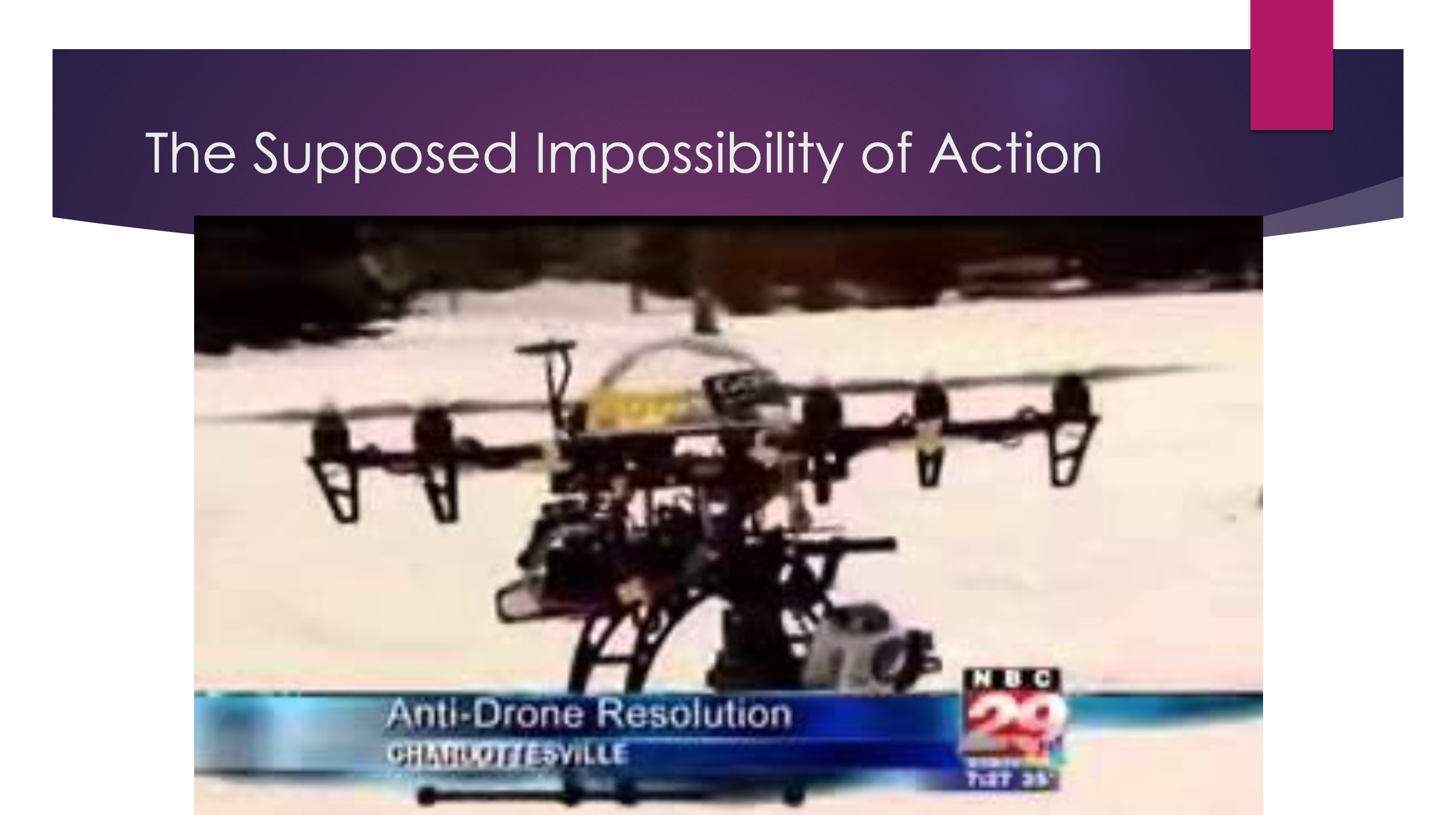 All is not hopeless in the world of anti-drone activism. In my town of Charlottesville, Virginia, in 2013, we successfully urged the city council to pass a resolution against drones. It said: “[T]he City Council of Charlottesville, Virginia, endorses the proposal for a two year moratorium on drones in the state of Virginia; and calls on the United States Congress and the General Assembly of the Commonwealth of Virginia to adopt legislation prohibiting information obtained from the domestic use of drones from being introduced into a Federal or State court, and precluding the domestic use of drones equipped with anti-personnel devices, meaning any projectile, chemical, electrical, directed-energy (visible or invisible), or other device designed to harm, incapacitate, or otherwise negatively impact a human being; and pledges to abstain from similar uses with city-owned, leased, or borrowed drones.”