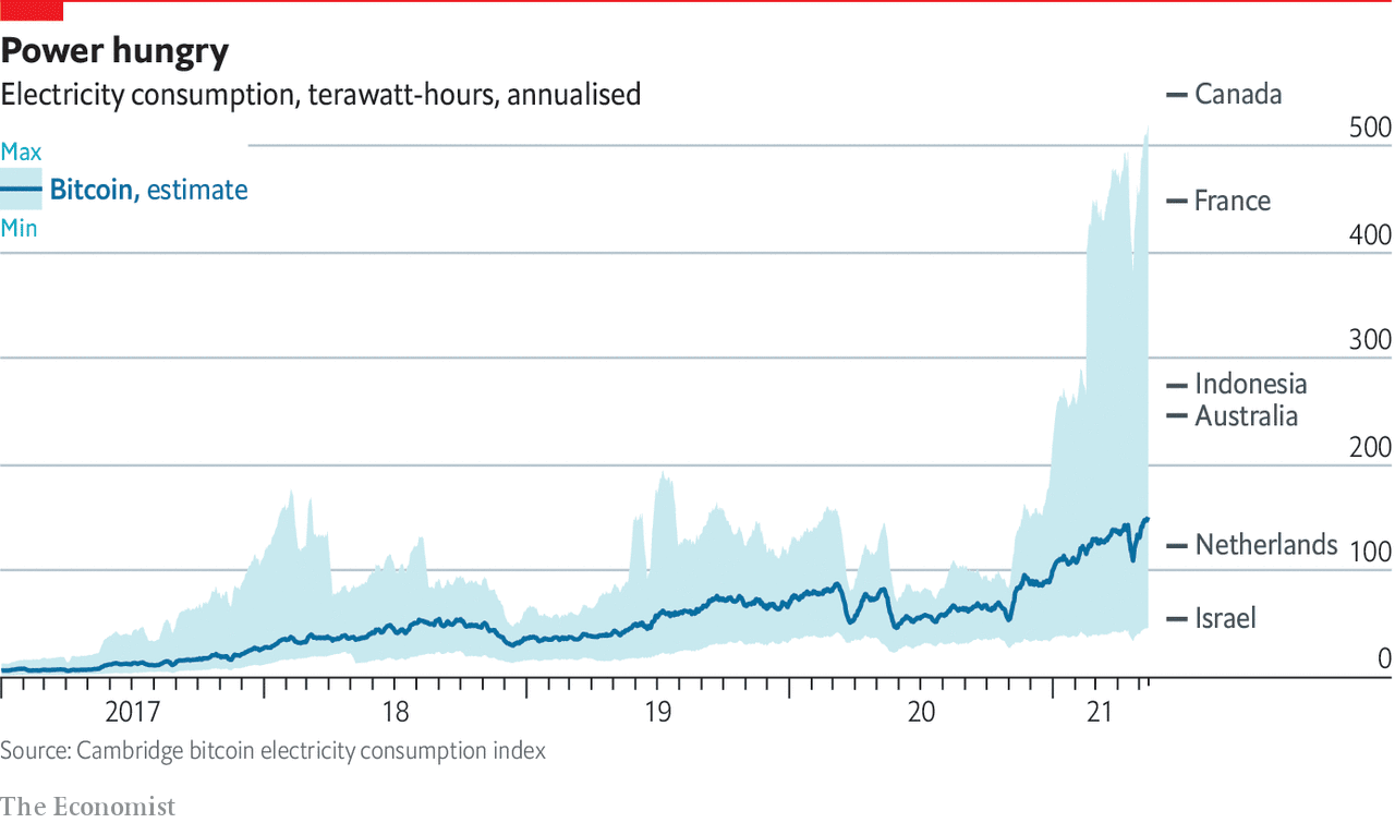 I’m not really a stock market guy so this whole bitcoin craze strikes me as bordering on the insane. But, if you are a bitcoin fan, know this: it has huge environmental costs—the energy needed for bitcoin “mining” could eventually equal the amount of energy consumed by all other data centers combined. Per The Economist: