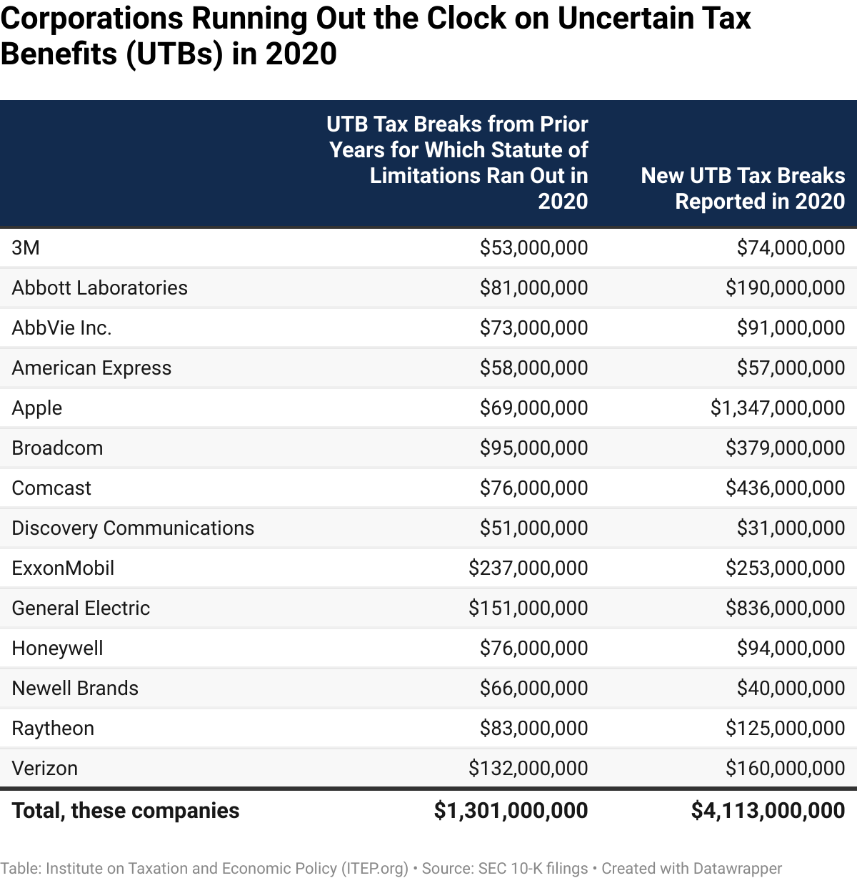 For more than a decade, tax law has required publicly traded corporations to publicly report “uncertain tax benefits” (UTBs), defined as tax breaks that authorities are likely to disallow. Companies report UTBs on the 10-k they submit to the Securities and Exchange Commission and make public.