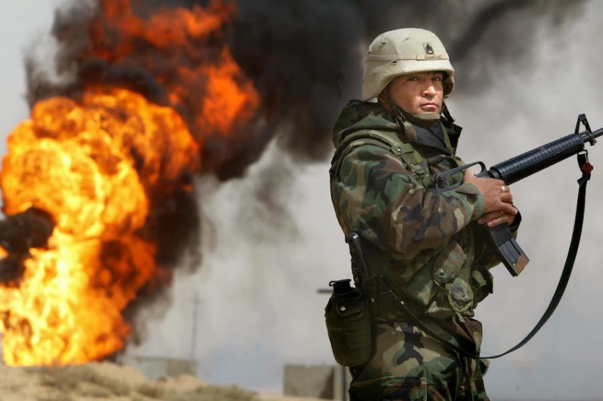 A U.S. soldier stands guard in March of 2003 next to an oil well at the Rumayla oil fields set ablaze by retreating Iraqi troops. (Photo by Mario Tama/Getty Images)