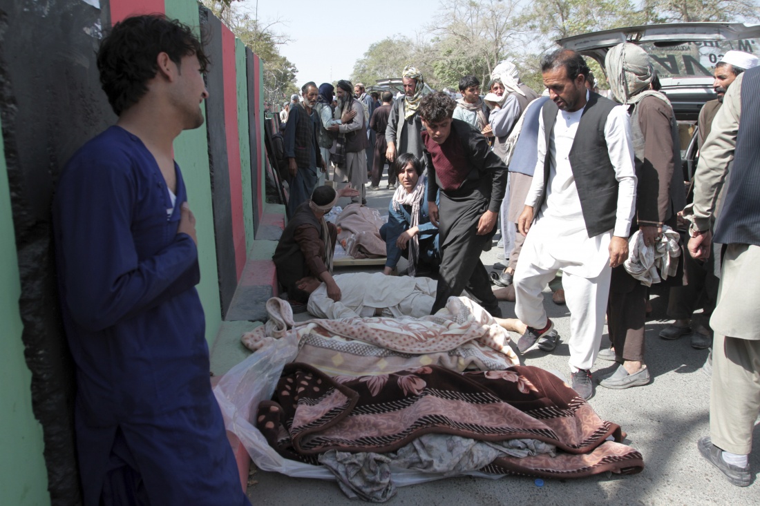 Afghan villagers stand over bodies of civilians during a protest in the city of Ghazni, west of Kabul, Afghanistan, Sept. 29, 2019. An airstrike by U.S.-led forces in eastern Afghanistan killed at least five civilians. (AP Photo/Rahmatullah Nikzad)