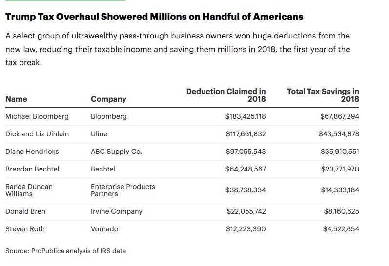 - Another fantastic piece of work from Pro Publica on tax dodging dropped yesterday entitled “Secret IRS Files Reveal How Much the Ultrawealthy Gained by Shaping Trump’s “Big, Beautiful Tax Cut”. The key nugget is the huge amounts of money reaped by rich people because of the change in how “pass-through” businesses are treated—profits in “pass through” companies…pass through directly to their owners, not to shareholders, and, then, those profits are taxed not via the corporation but on the individual owner’s returns. The tax change, pitched as a “small business” benefit was nothing of the sort. As you can see from this chart: