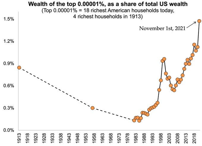 In 1913, the top 0.00001% (= Rockefeller, Frick, Carnegie, Baker) owned 0.85% of total US wealth. Today the top 0.00001% owns 1.5% of total US wealth. Their share is sky-rocketing