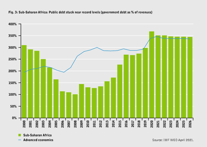All too often, debt service is hampering crisis responses and worsening development prospects. In many developing and emerging countries, external public debt service is greater than health care expenditure and education expenditure (Munevar, 2021a). Thus, instead of being able to support their people to weather the crisis and invest in a sustainable recovery, governments are required to repay their creditors. UNDP estimates that close to US$1.1 trillion is due in debt service payments by developing and emerging countries in 2021 alone (Jensen, 2021). Just 2.5% of that amount would be enough to vaccinate two billion people under the COVAX initiative. [emphasis added]