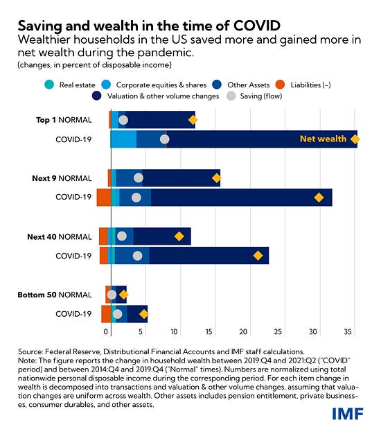 In other words, as usual, the richest in society do better than everyone else because they continue to pile up wealth as their assets appreciate largely because they don’t have to spend any extra cash on trying to survive.