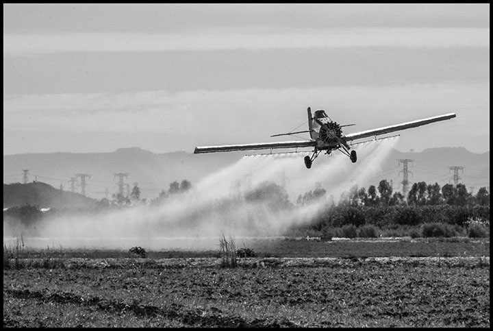 A crop duster sprays pesticides on a field next to the U.S./Mexico border in the Imperial Valley.