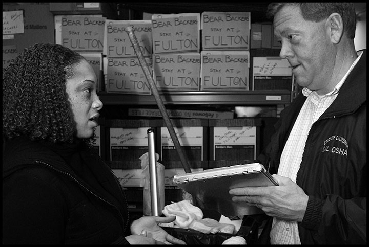 Garrett Brown, a former inspector for CalOSHA, interviews a worker about her workplace health and safety complaint.