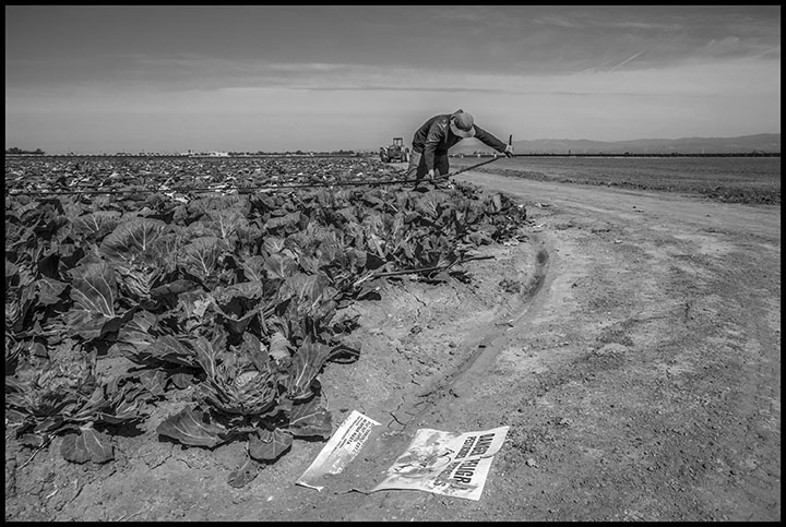 A sign in the dirt of a cabbage field warns of the dangers of the pesticides used on the crops. All photos by David Bacon