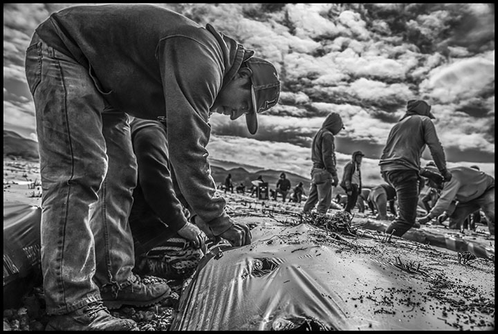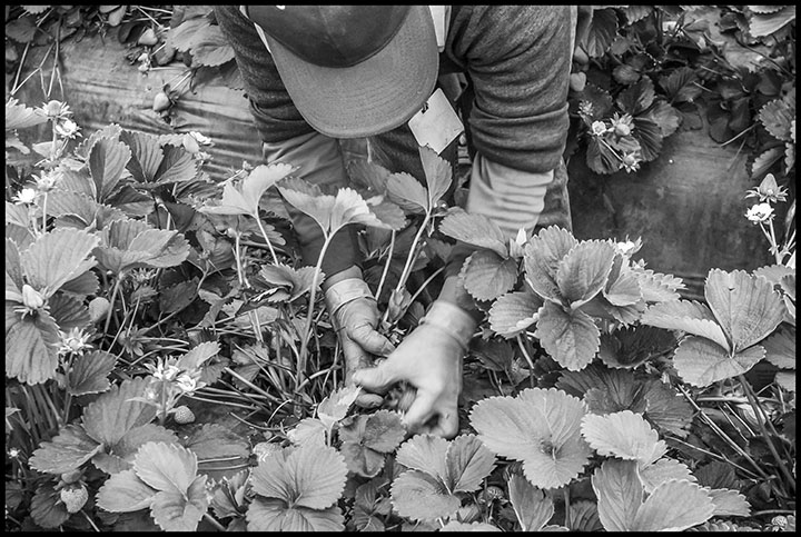 THE HUMAN COST OF A STRAWBERRY WAGE By David Bacon Civil Eats, 4/24/24 https://civileats.com/2024/04/24/strawberry-farmworkers-fight-for-a-living-wage/ https://davidbaconrealitycheck.blogspot.com/2024/04/the-human-cost-of-strawberry-wage.html ![]() Guillermina Diaz, a Mixtec immigrant from Oaxaca, picks strawberries. She and her sister Eliadora support three other family members, all of whom sleep and live in a single room in a house.. Driving north on California's Highway 101 through the central coast, a traveler approaches the Santa Ynez Valley through miles of grapevines climbing gently rolling hills. Here humans have mastered nature, the landscape seems to say - a bucolic vision of agriculture with hardly a worker in sight. Perhaps a lone irrigator adjusts drip pipes or sprinklers. Only during a few short weeks in the fall can one see the harvest crews filling gondolas behind the tractors. Even then, you'd have to be driving at night, when most grape picking now takes place under floodlights that illuminate the rows behind the machines. As 101 winds out of the hills, the crop beside the highway suddenly changes. Here endless rows of strawberries fill the valley's flat plane. Dirt access roads bisect enormous fields, and beside them dozens of cars sit parked in the dust. Most are older vans and sedans. Inside this vast expanse dozens of workers move down the rows. From the highway, many fields are hidden by tall plastic screens. Growers claim they keep animals out, but they are really a legacy of the farmworker strikes of the 1970s. Then growers sought to keep workers inside, away from strikers in the roadway calling out to them, urging them to stop picking and leave. The abusive and dangerous conditions of strawberry workers today, and the eruptions of their protests over them, make the screens more than just a symbol of past conflict. Picking strawberries is one of the most brutal jobs in agriculture. A worker picking wine grapes in the hills can labor standing up. But the men and women in the strawberry rows have to bend double to reach the berries. As strawberries ripen, they hang over the side of raised beds about a foot high, covered in plastic. In a ditch-like row between them, a worker pushes a wire cart on tiny wheels. Each holds a cardboard flat with 8 plastic clamshell containers - the ones you see on supermarket shelves. ![]() Eduardo Retano plants root stock of strawberry plants. The pain of this labor is a constant. Many workers will say you just have to work through the first week, when your back hurts so much you can't sleep, until your body adjusts and the pain somehow gets less. At the start of the season in March, rain fills the rows with water and the cart must be dragged through the mud. When summer comes the field turns into an oven by midday. Through it all, workers have to pick as fast as possible. "At the beginning of the season there aren't many berries yet," Matilde told me. She'd been picking for three weeks, her fifth year in the strawberries. "The mud makes heavy work even heavier. It's hard to pick even 5 boxes an hour, but if I can't make that, or if I pick any green berries, it gets called to my attention. The foreman tells us we're not trying hard enough, that they don't have time to teach us, and if we can't make it we won't keep working. Some don't come back the next day, and some are even fired there in the field." Mathilde didn't want to use her last name because being identified might bring retaliation from her boss, a fear shared by another worker, Juana. "Not many people can do this job," Juana told me in an interview. She came to Santa Maria from Santiago Tilantongo in Oaxaca and speaks Mixtec (one of the many indigenous languages in southern Mexico), in addition to Spanish, like many strawberry pickers living in the Santa Ynez Valley. She's been a strawberry worker for 15 years. "I have permanent pain in my lower back," she said, "and when it rains it gets very intense. Still, I get up every morning at 4, make lunch for my family, and go to work. It's a sacrifice, but it's the only job I can get." ![]() Eliadora Diaz, a Mixtec immigrant from Oaxaca, picks strawberries with her sister Guillermina. Low Wages, High Cost of Living On April 1 the Alianza Campesina de la Costa Central (Farmworker Alliance of the Central Coast) organized an event timed to gain public notice at the beginning of the strawberry season. The objective was to pressure growers to raise the wages. The Alianza issued a powerful 44-page report, Harvesting Dignity, The Case for a Living Wage for Farmworkers, that documents in shocking statistics what Mathilda and Juana know from personal experience. Those statistics reveal that the mean hourly wage for farmworkers in Santa Barbara County was $17.42 last year, which would produce a yearly income of $36,244 for a strawberry picker working fulltime, all twelve months. But this calculation includes the higher wages of foremen and management employees. Juana, after 15 years, made $16, the state minimum wage, and Mathilde after five years made the same. In reality, their annual income was much lower because even working the entire season, they would get no more than eight months of work, and often less. At the beginning of the season there are not enough berries for 8 hours each day, so Mathilda only got 6 hours, or 36 hours in a week working on Saturday too. Juana's week in late March was 15-20 hours. At the height of the season wages go up because growers begin to pay a piece rate, which last year was usually $2.20 for each flat of eight clamshell boxes. To make the equivalent of the minimum wage, a worker would have to pick over 7 flats an hour, and earning more than minimum wage on the piece rate means working like a demon, ignoring the physical cost. At the beginning of the season, "champion pickers can do 8 or 9 an hour," Mathilde explains. "but not everyone can. 6 or 7 is normal." Fulltime work at minimum wage for eight month