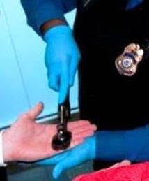 Once the pat-down was over, I was subjected to a thorough wipe down for explosive residue. They first went through all of my belongings and took cotton swabs of my underwear, clothing and electronics. The TSA says its Explosives Trace Detection (ETD) process is used to detect explosive residues on an individual or his belongings. The agent uses a sterile cotton swab and attaches it to a long instrument (shown in the photo). The agent used separate swabs to wipe the backs and front of each hand and both sides of both my arms. The also rubbed new swabs against the front and backs of both legs, from my ankles to my knees.
