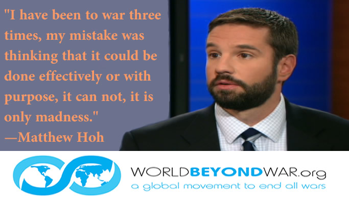 Matthew Hoh is a member of the advisory boards of Expose Facts, Veterans For Peace, and World BEYOND War. In 2009 he resigned his position with the State Department in Afghanistan in protest of the escalation of the Afghan War by the Obama Administration. He previously had been in Iraq with a State Department team and with the U.S. Marines. He is a Senior Fellow with the Center for International Policy.