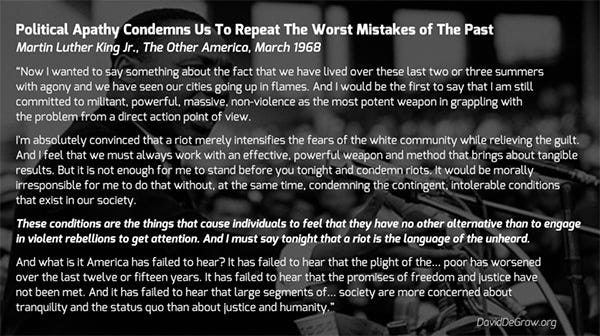 In the grand scheme of things, this is not about any particular instance of police brutality or whether a tragic death happened through proper police procedure or not, there are much deeper societal dynamics at play. What is playing out on the streets is a byproduct of an economic and political system that has been rigged against hardworking Americans and poor people who have been thrown overboard.
