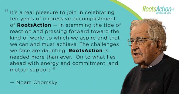Noam Chomsky has this to say: "It's a real pleasure to join in celebrating ten years of impressive accomplishment of RootsAction -- in stemming the tide of reaction and pressing forward toward the kind of world to which we aspire and that we can and must achieve. The challenges we face are daunting. RootsAction is needed more than ever. On to what lies ahead with energy and commitment, and mutual support."