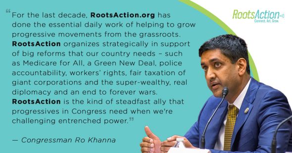 Congressman Ro Khanna says, “For the last decade, RootsAction.org has done the essential daily work of helping to grow progressive movements from the grassroots. RootsAction organizes strategically in support of big reforms that our country needs – such as Medicare for All, a Green New Deal, police accountability, workers’ rights, fair taxation of giant corporations and the super-wealthy, real diplomacy and an end to forever wars. RootsAction is the kind of steadfast ally that progressives in Congress need when we're challenging entrenched power.”