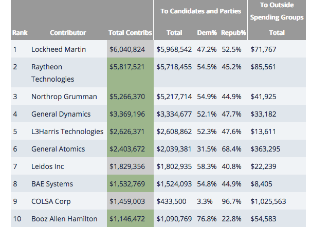 concentrated. One-quarter to one-third of all Pentagon contracts in recent years have gone to just five major weapons contractors: Lockheed Martin, Boeing, General Dynamics, Raytheon, and Northrop Grumman.These five companies received over $286 billion in contracts in Fiscal Year 2019 and Fiscal Year 2020 alone (see Table 1). From FY 2001 to FY 2020 these five firms alone split over $2.1 trillion in Pentagon contracts (in 2021 dollars). To put these figures in perspective, the $75 billion in Pentagon contracts received by Lockheed Martin in FY 2020 is well over one and one-half times the entire budget for the State Department and Agency for International Development for that year, which totaled $44 billion. [emphasis added]