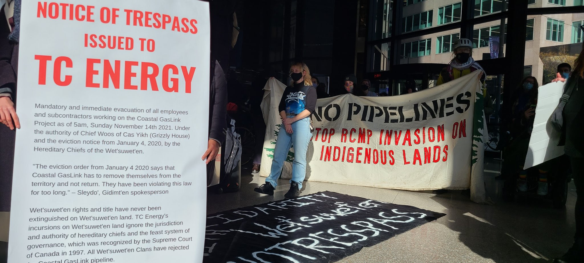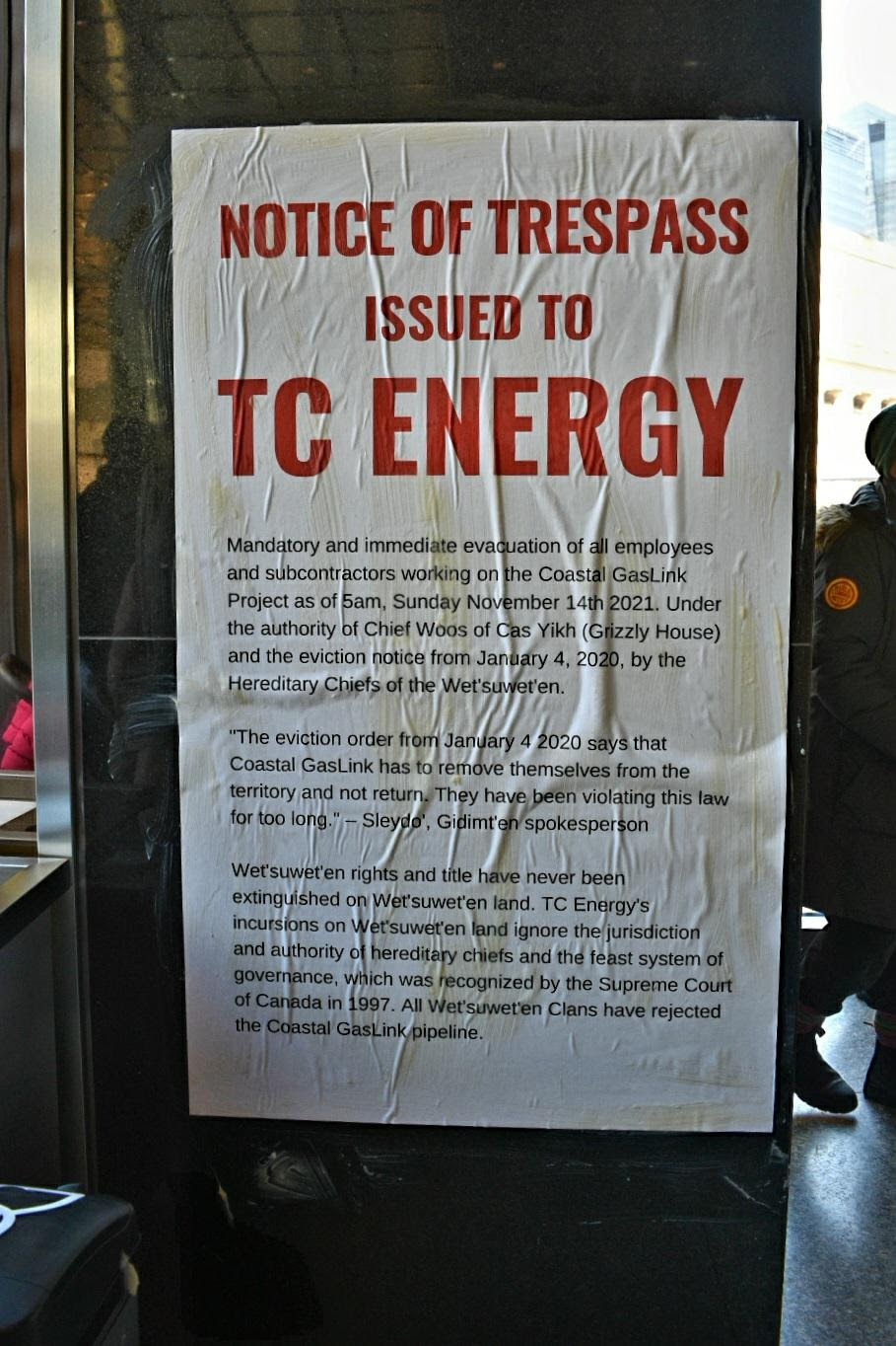 Toronto, Ontario — Hundreds of people entered the lobby of the building where TC Energy Corporation’s office is located, pasting up oversize ‘trespass notices’ for their attempt to force through the Coastal GasLink pipeline on unsurrendered unceded Wet’suwet’en Indigenous territory. Indigenous community members and supporters took over the lobby with drumming and dancing.