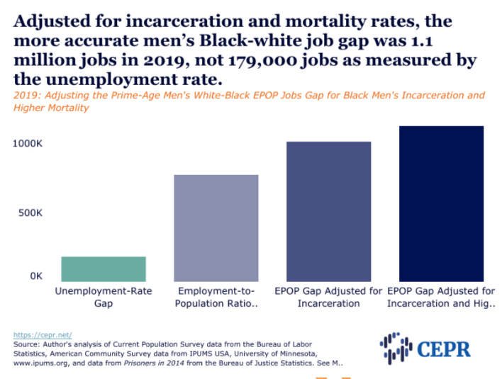 A problem with the official labor market statistics is that they do not include the Black men who are incarcerated or allow us to evaluate the economic impact of the higher mortality rate of Black men. Prime-age Black men who are incarcerated or deceased still have children, family members, and partners who, under different circumstances, could benefit from their financial support. When one takes into account the incarceration and mortality rates of Black men, the EPOP jobs gap jumps to four times the unemployment rate jobs gap, and the income deficit approaches $50 billion a year.