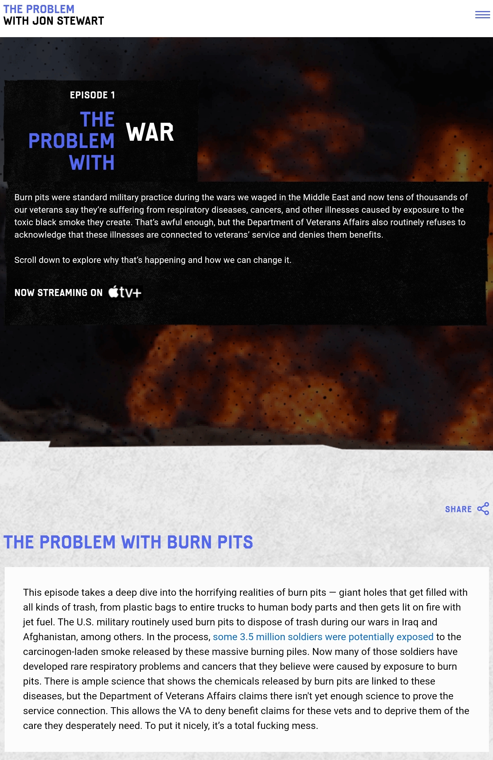 We're so thankful for your continued support and kindness to us as we continue on our fight for our veterans. This year, we've been blessed with having our mission make national news and conversations, especially with our friend and advocate, Jon Stewart. He recently unveiled a new website TheProblem.com where visitors can learn more on the issue, watch exclusive footage, meet impacted service members, and take direct action. We encourage you to visit this website and share on social media and tag us (@burnpit360).