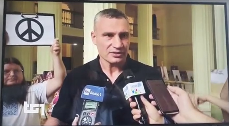 The author holds up a sign behind Mayor of Kyiv Vitali Klitschko