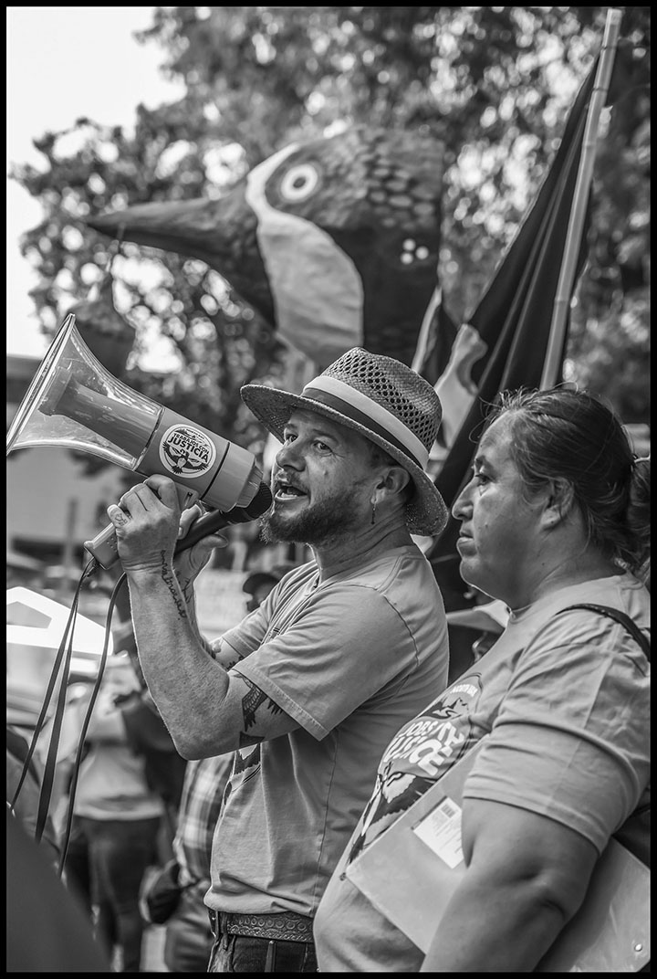 | WEALTHY WINERIES ROUTINELY ENDANGER WORKERS By David Bacon , Truthout, August 27, 2024 https://truthout.org/articles/californias-wealthy-wine-industry-routinely-endangers-health-of-its-workers/ https://davidbaconrealitycheck.blogspot.com/2024/08/wealthy-wineries-routinely-endanger.html Between wildfires and immigration status, California vineyard workers contend with a host of hurdles to their health.  Farmworkers and their supporters occupy a highway bridge during their march demanding pay for working during wildfires. David Bacon From mid-August through mid-November, the grape harvest in California's North Bay wine country coincides with the state's wildfire season. Every night at midnight during those 12 weeks, workers in bandanas and face masks walk quickly into the vineyards. For the next eight or 10 hours, as the darkness slowly becomes dawn, they practically run down the rows. Their curved knives cut grape bunches from the vines, dropping them into the pails held by harnesses to their chests. When the pails are full, the workers rush to the gondolas behind the slow-moving tractors, dump in the grapes, and hurry back to fill them again. The air fills with dust from feet and machines. But often a wildfire, grown huge at the end of a dry summer, casts a pall of smoke that can extend for dozens of miles. When it reaches the vineyards in Sonoma and Napa Counties, smoke combines with dust and it's hard to breathe. "Even my saliva turns black," says Maria Salinas, who has picked wine grapes for 20 years in Sonoma County. The danger of wildfire smoke comes from its fine particles, which lodge themselves so deeply in the lungs that the body can't easily expel them, causing shortness of breath, asthma, heart disease, and other illnesses. A study published in June 2024 has documented 2,305 premature deaths from wildfire smoke in Sonoma County, and 693 in Napa County, between 2008 and 2018. For the farmworkers in the vineyards, however, the smoke and dust compound existing endemic health problems. The social determinants of their health - the way that their well-being is impacted by the economic and social forces acting on them - include the conditions at work, like the wildfire smoke they inhale. Poverty can also have a tremendous impact. The Rural Health Information Hub lists many potential complications from the living and working conditions of farmworkers, including heat-related illness, pesticide exposure, job injuries, urinary tract infections because of the lack of toilet facilities, high disease rates from tuberculosis and COVID caused by crowded living conditions, and depression due to poverty and stress. Maria Salinas's experience shows the way these conditions pile up. She arrived in the U.S. in 2002 from her Chatino-speaking hometown in Oaxaca, Santos Reyes Nopala. "When I started work in the grapes, there was a lot of injustice," she remembers. "It's been 20 years of humiliation. We didn't have water or bathrooms. When I had to urinate, I had to go at the edge of the field. My father worked in the fields for 14 years, and died of cancer of the stomach." California state law has mandated employers provide bathrooms and water in the field for years, but Salinas says that it took worker pressure on the county to get enforcement. "It's gotten better, but now the smoke is on top of all of this. My allergies have turned into asthma and I have to use an inhaler. I've had to go to the emergency room because I couldn't breathe. I'm afraid that if I keep working in these conditions, I'll have permanent damage. But I have a family to support." A few years ago, Salinas went to a meeting to hear a professor from Berkeley explain the dangers of the smoke, where she met Max Bell Alper, the executive director of North Bay Jobs with Justice (JwJ). "We had intense fires in 2017," Alper said, "and fires every year until 2020, when it was really bad. We started training farmworkers to survey their communities, to get people's experiences and find out what they wanted to do about it."  Max Bell Alper, executive director of North Bay Jobs with Justice, speaks at a rally in Healdsburg, California, on July 28, 2024.David Bacon Alper and JwJ trained an equipo, or team, of farmworker organizers, and began holding broader meetings, which organized workers based on their employers, as well as their family and hometown networks. Maria Salinas became one of those equipo organizers. Because most farmworkers in the North Bay come from Indigenous Mexican communities, the surveys and work that came out of them had to be done in their original languages. The broader meetings of workers decided on five basic demands to make of the area's wineries and grape growers: provide clean bathrooms and water; hazard pay; disaster insurance to ensure income if workers were sent home; community safety observers to monitor conditions in the fields; and communication in the workers' own languages. These demands were based on the fact that growers are sending workers into the vineyards even during wildfires, although evacuation orders mandate that people leave because of the danger. In 2022, the workers, along with Jobs with Justice, took those demands to the Sonoma County Board of Supervisors. They asked the county to make their demands requirements for growers who ask permission to send workers to harvest in wildfire evacuation zones. Many of the wineries, however, balked at the demands. To them, the effort would mean not only an increase in their costs, but also signaled the potential danger of organized workers advocating for change. In response, they brought in a notorious union-buster, Raul Calvo. As The Guardian reported in 2022, Calvo played a key role in bringing pro-company workers to testify to the county against the proposal, wearing t-shirts saying "NB [North Bay] JwJ does NOT Speak for Me." Alper charges that many of the workers brought by Calvo were working on H-2A visas. The H-2A program allows growers to recrui